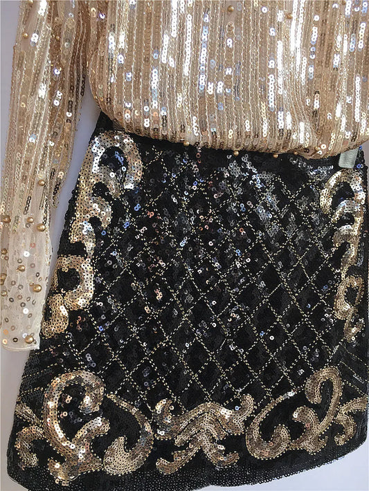 Birthday Party New Women's Fashion Heavy Craft Nail Bead Long Sleeve Sequin Shirt With Buttocks And Skirt 2pcs Set