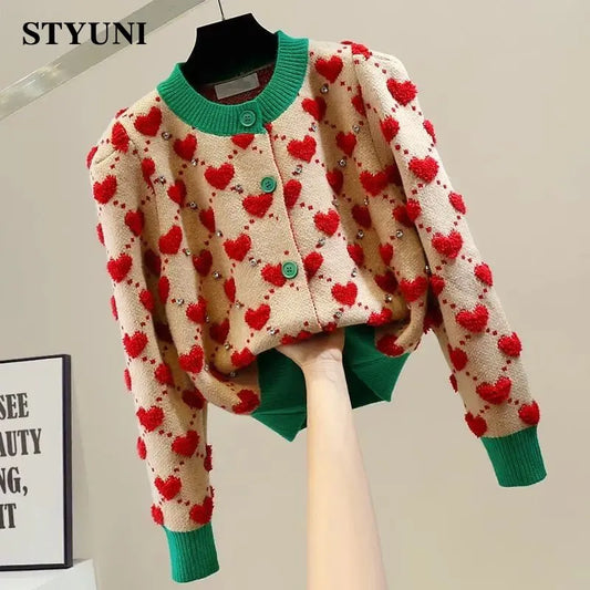 Heart Argyle Diamonds O-Neck High Street Kawaii Knitted Women's Sweaters Long Sleeve Buttons Short Jumpers Female Cardigans