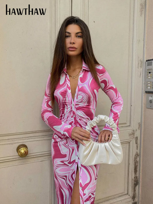 Hawthaw Women Autumn Winter Long Sleeve Printed Bodycon Pink Pencil Midi Dress Streetwear Wholesale Lots Bulk Clothes