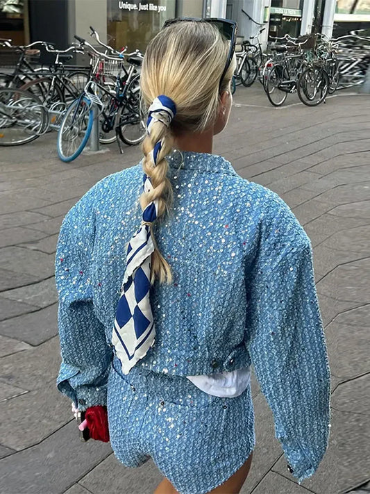 Fashion Sequin Short Pant Suit For Women Loose Lapel Single Breasted Coat 2 Pieces Sets Spring Summer Chic Female Streetwear