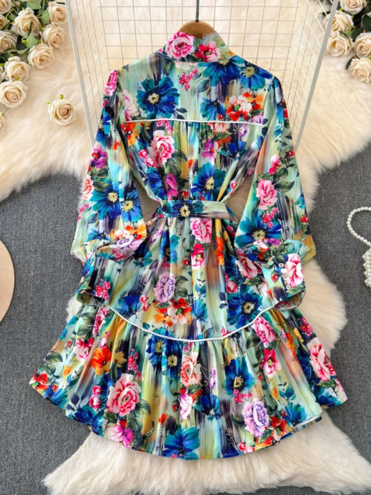 Designer stylish mini floral blue v-neck dress lantern sleeve buttons A-line fashion boho vintage vestidos clothing new